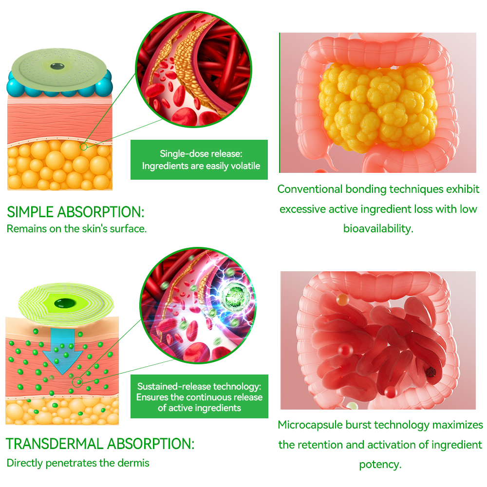 Transdermal Absorption Technology: After bursting, the active ingredients penetrate the stratum corneum, reach the dermis, then enter the bloodstream, and finally spread throughout the body. Other patches simply rely on the solubility of the ingredients (lipophilic or hydrophilic) for absorption.