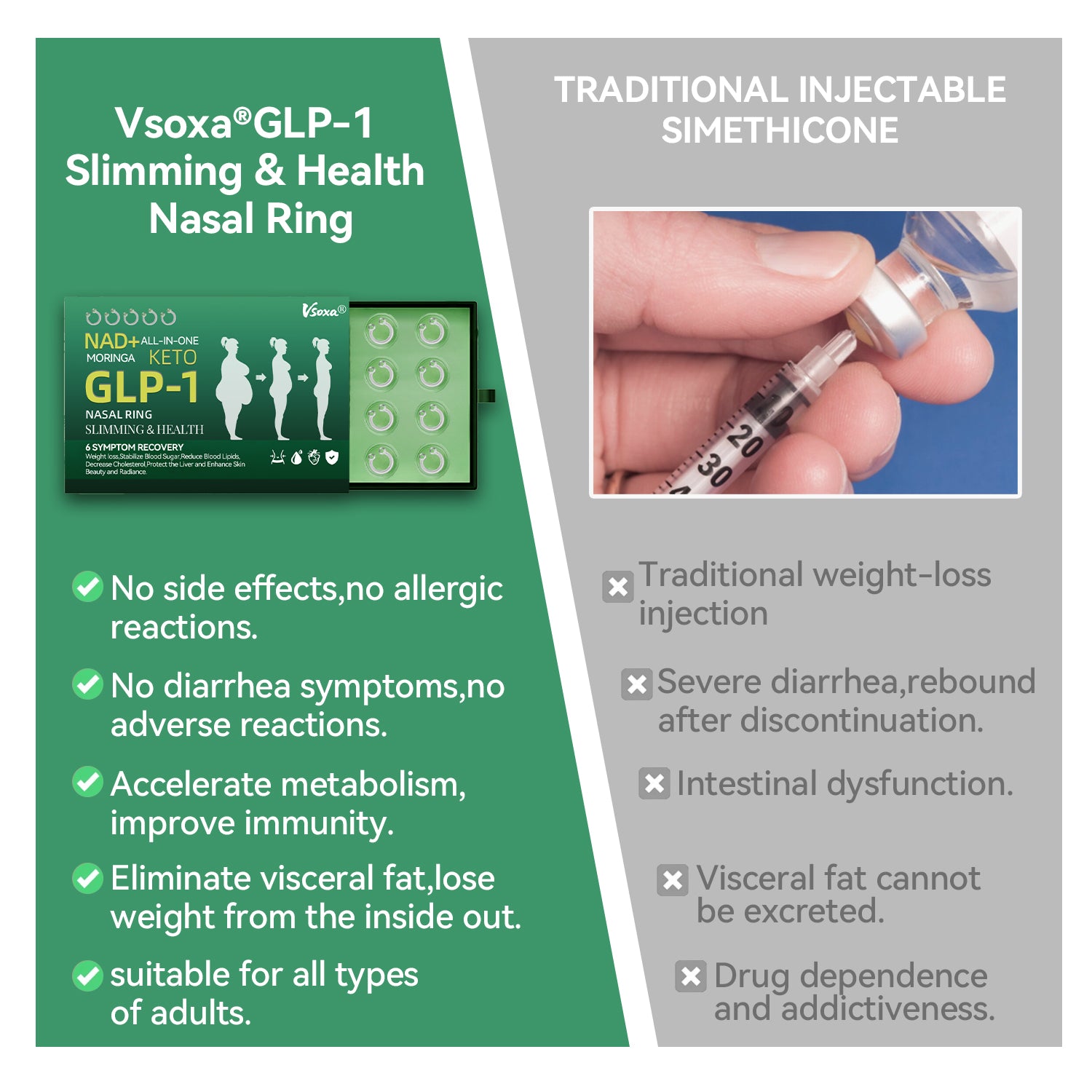 The ๐๐ฌ๐จ๐ฑ๐ยฎ GLP-1 Slimming & Health Nasal Ring offer a long-lasting, slow release of the medication, ensuring a stable effect over 24 hours without causing any discomfort. With the same dosage and price, it can maintain up to 20 times longer-lasting effects (similar to the difference between an IV drip and a single injection).
